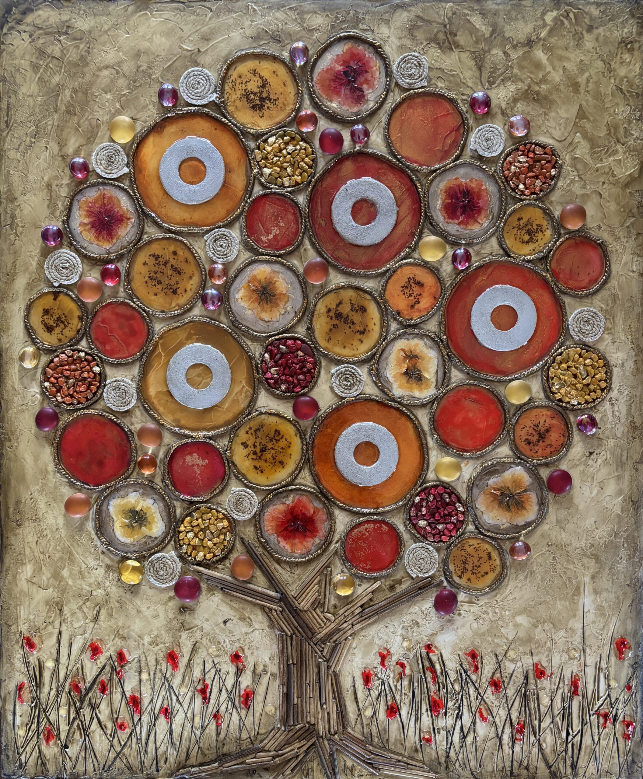 “… Quest’opera materica celebra la storia di una famiglia, intrecciando memoria ed emozione attraverso la simbologia dell’Albero della Vita. Ogni elemento materico diventa metafora della famiglia, un intreccio di storie, caratteri e percorsi diversi che, pur nelle loro unicità, si fondono armoniosamente in un’unica grande struttura….”